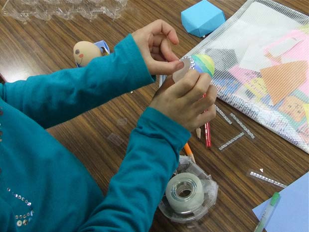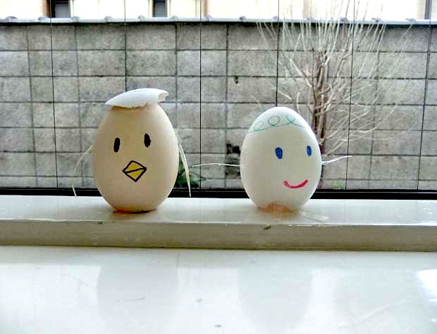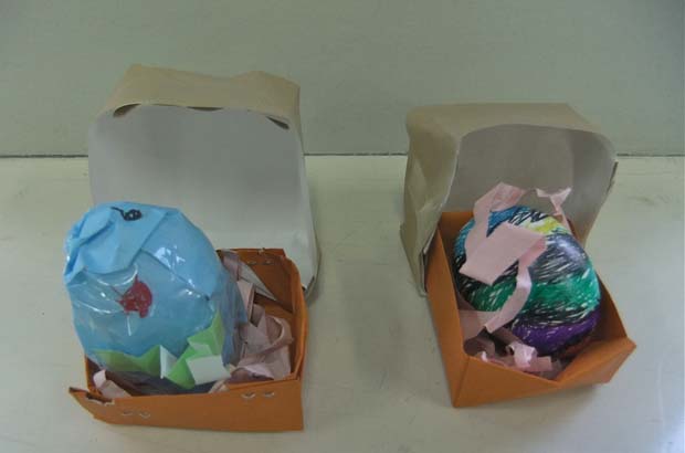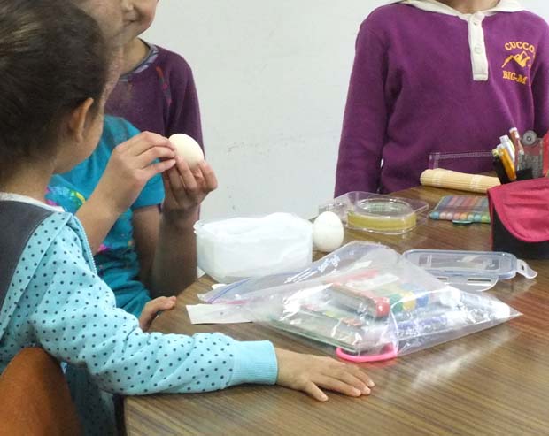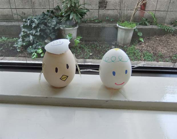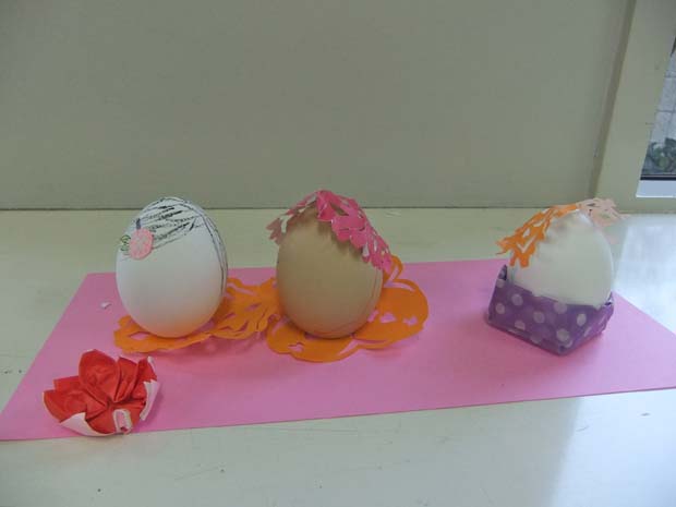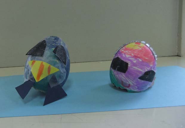 3月工作の様子(美術から子育てを学ぶ会) 投稿日時: 2014/04/22 投稿者: Tomoko Maezawa 3月のテーマは 『イースターエッグを作ろう!』です。 卵を殻を使って、自由な発想でイースターエッグを作りました。 卵の形を観察しながら、楽しそうにアイデアを相談中。 描いている時に殻が割れてしまったのですが、その形からアイデアが生まれたようです。 イースターエッグ作りは、ユニークな作品が出来る人気の工作の一つです。 割れた部分の形を活かしました。 角度によって人形の表情が変わります。 3人兄弟です。入れ物も作りました。 割れた形から発想して。 個性豊かなエースターエッグができました。