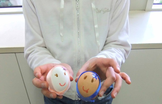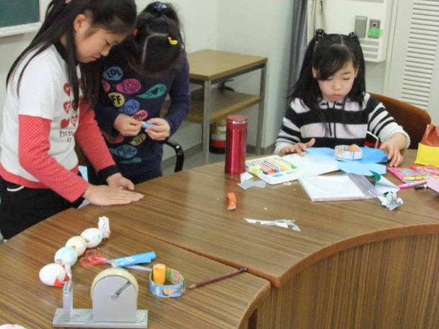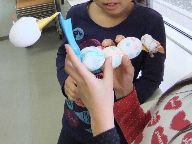 3月工作の様子 投稿日時: 2013/03/21 投稿者: Tomoko Maezawa 3月のテーマは 『イースターエッグを作ろう!』です。 『犬』『魚』『お菓子』などテーマを決め 自由な発想で制作しました。 2人で作った作品『へび』 卵の黒い点をほくろに見立てて大人っぽく。『帽子を被ったお姉さん』 卵の茶色をいかして『犬と犬小屋』 卵の割れているところを、魚の口にしました。 リボンで服を作りました チョコレートのお菓子みたい 川崎浩子さん晋太郎くん親子の合作です!
