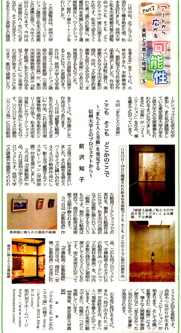 アートから広がる可能性Part7 投稿日時: 2013/04/22 投稿者: Tomoko Maezawa Part7-5『ここも そこも どこかのここで〜「まちと人と美術」を発見する信州大学とのプロジェクトから〜』 南信州新聞に掲載中 (現在Part8、全37回まで執筆)
