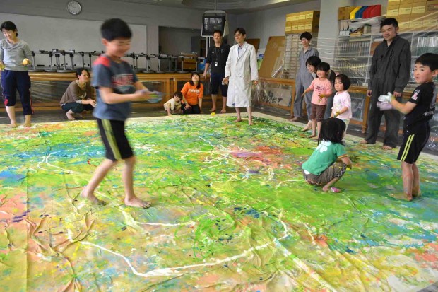 この建築における外部とは地域社会も含まれます。作品の素材はワークショップ(巨大な綿布上で全身での絵具体験)の地元参加者により出来た綿布を使用し、作品に様々な関係性を取り込み制作しました。