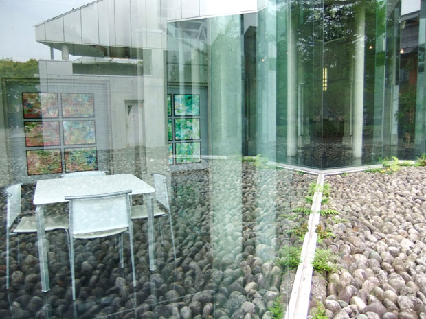 ロビー空間の黒い床と外壁のガラスには鏡のように外部の像が内部に写り込む効果があり、「内部の来館者や展示」と「外部の散歩の人々や自然など風情」が幾重にも重層され、相互にかかわり合う空間が生まれます。この空間要素を取り入れて「空間絵画」を展示します。