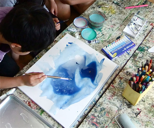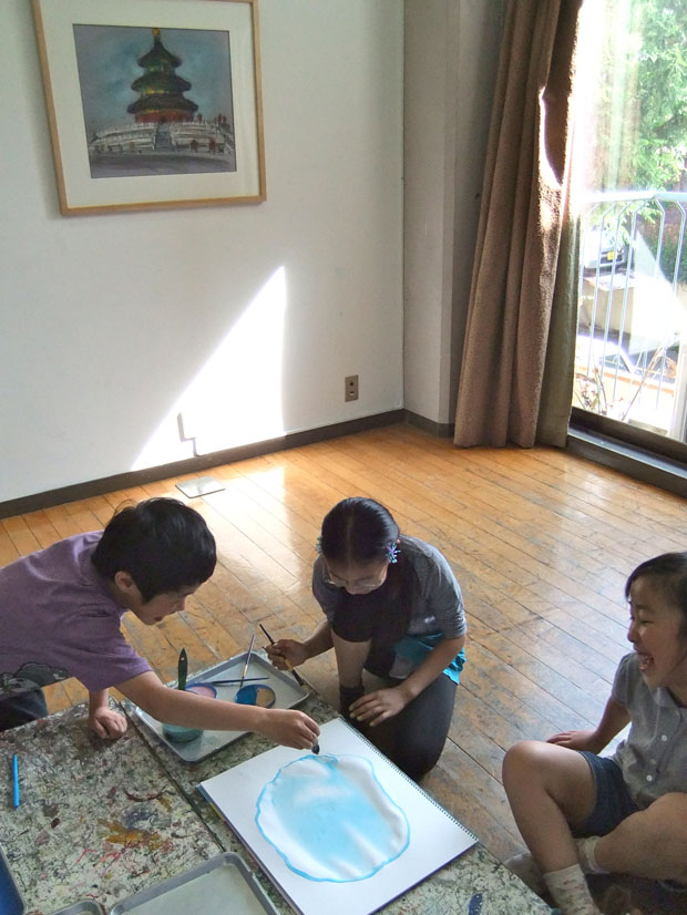 5月のアトリエ 投稿日時: 2013/06/04 投稿者: Tomoko Maezawa この日の、子どもクラスの制作テーマは 「色彩あそび」です。 絵具の色を一色ずつ足していきます。 友だち同士で何に見えるかなど、話しながら進めます。 「貝に見える」「珊瑚の模様みたい」「鳥の形だ」 同じ絵でも、絵具の模様や形など、見ている所やイメージはそれぞれ異なります。 息を吹きかけて、絵具を混ぜながら 変化する絵具の表情を楽しみます。 展示してある絵画は、アトリエを創設された利根山光人さんの作品です。