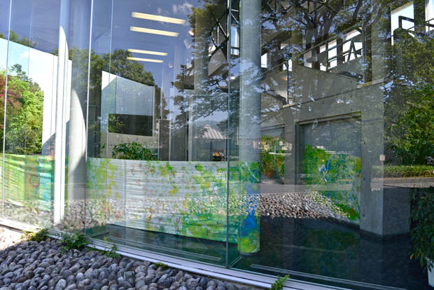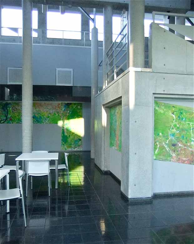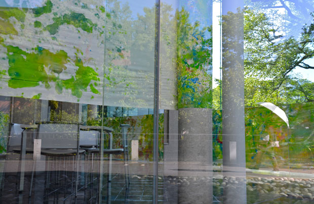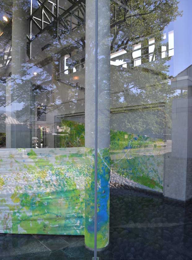 作品は画面の両面(表と裏)から鑑賞でき、それを建物内外からも鑑賞できます。それにより、鑑賞者の立ち位置で絵画の矩形が、そして光の状況などで画面の表情が変わります。