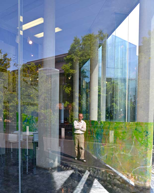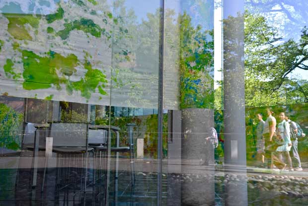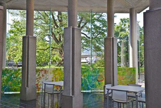 ロビー空間の黒い床と外壁のガラスには鏡のように外部の像が内部に写り込む効果があり、「内部の来館者や展示」と「外部の散歩の人々や自然など風情」が幾重にも重層され、相互にかかわり合う空間が生まれます。