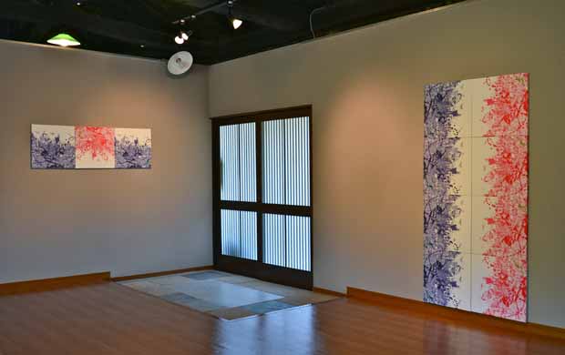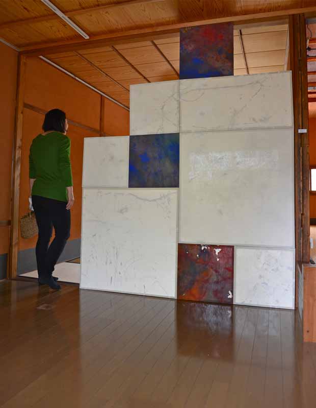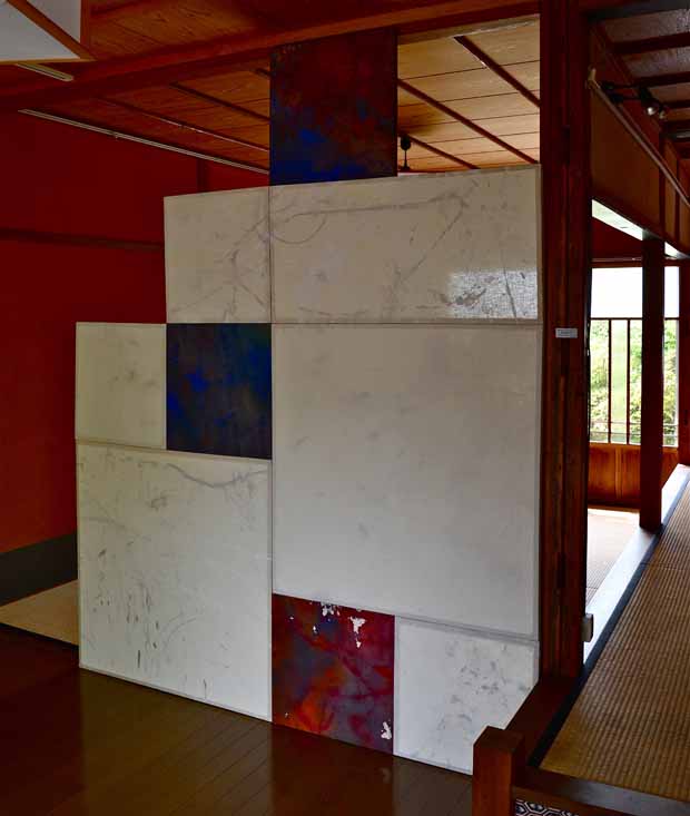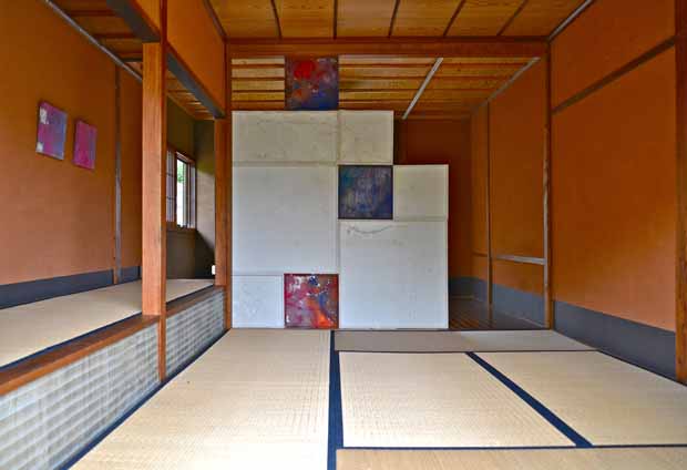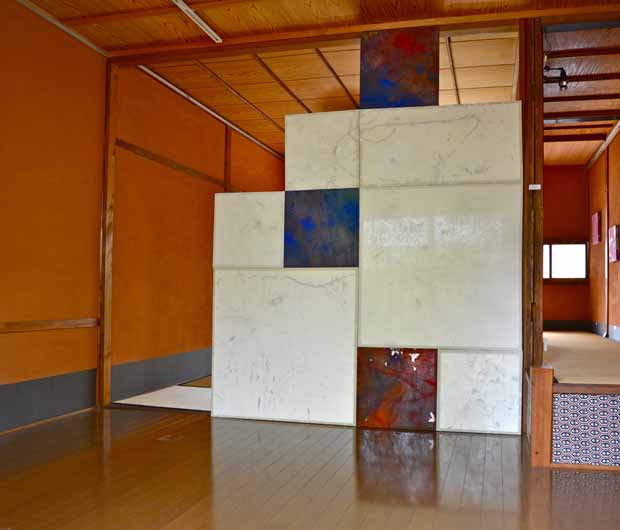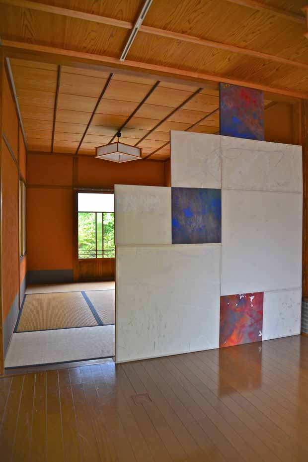 作品は日本家屋の特徴が、インスタレーションとして作品に取り込みやすい要素を持つように制作しました。 このパネルの基本サイズは畳のサイズから出されているため、日本家屋に自在に合わせることができます。