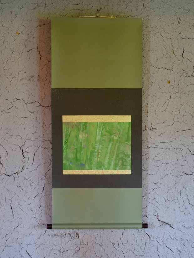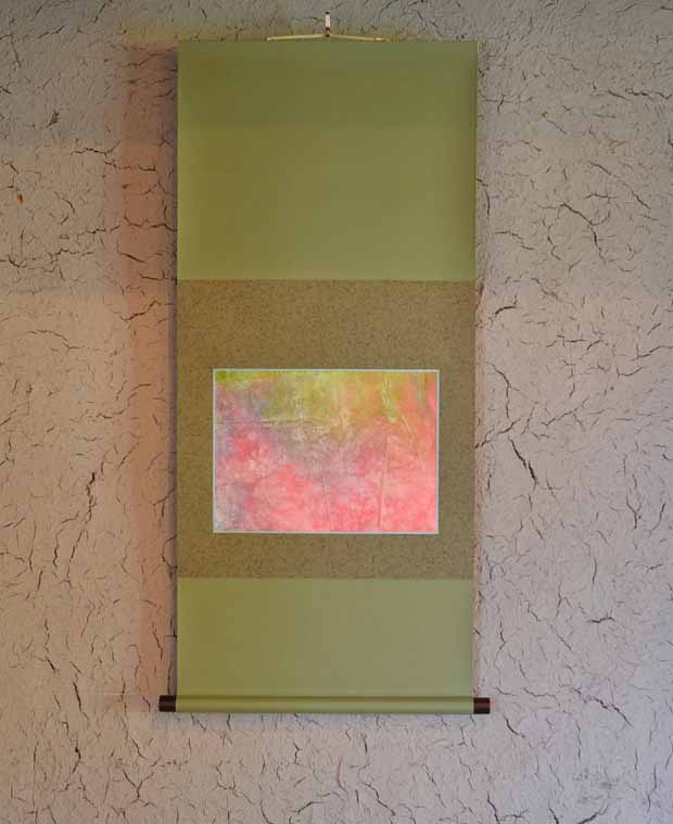 制作方法:全身での絵具行為によるワークショップでの素材(綿布)をトリミング、カットしたもの (4枚絵画、掛け軸、シルクスクリーン)