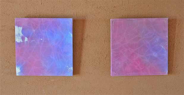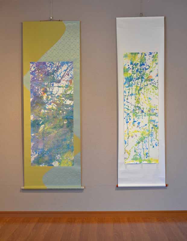 この4枚の絵画も、天地などの位置を、空間に合わせて組み替えることができます。 また透過性/不透過性の素材で描かれているため、光の状態で作品の見え方も変化します。