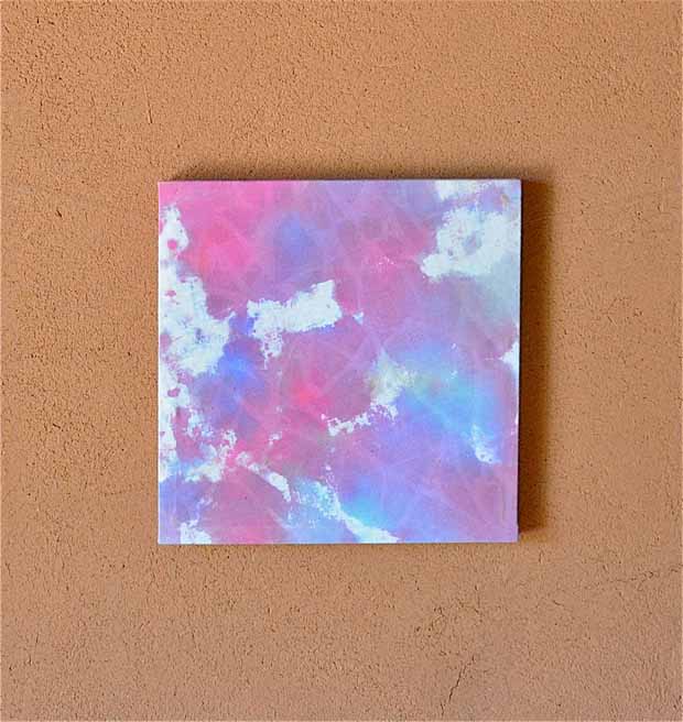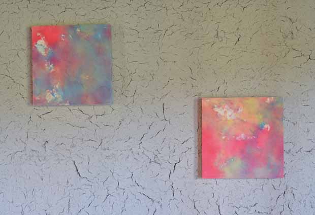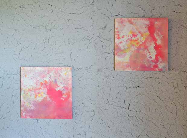 この作品は、45㎝の正方形を1単位として、 45×45、45×90、90×90(㎝)の3つのサイズのパネル9枚の組み合わせで構成されています。 9枚をスペースに合わせて自由に組み合わせることで、 その場の空間要素を取り入れた空間絵画を展示しました。