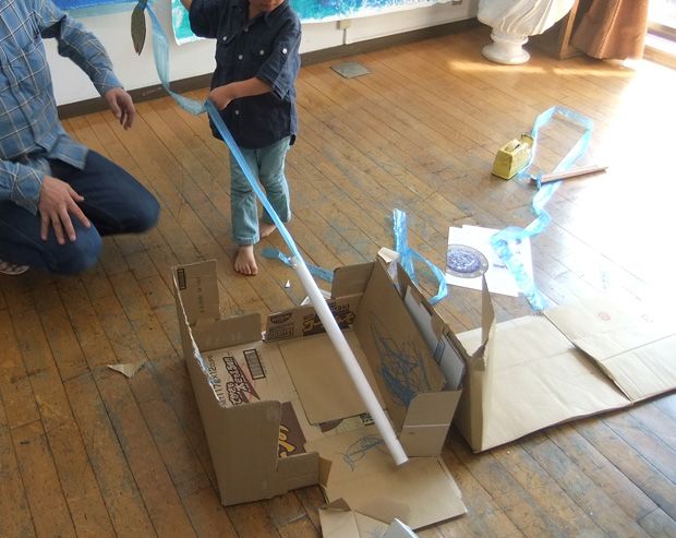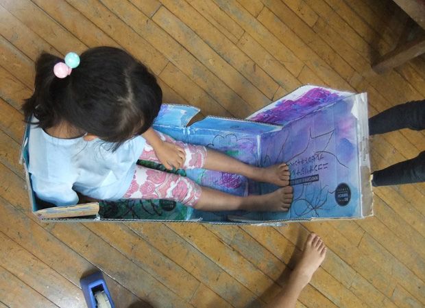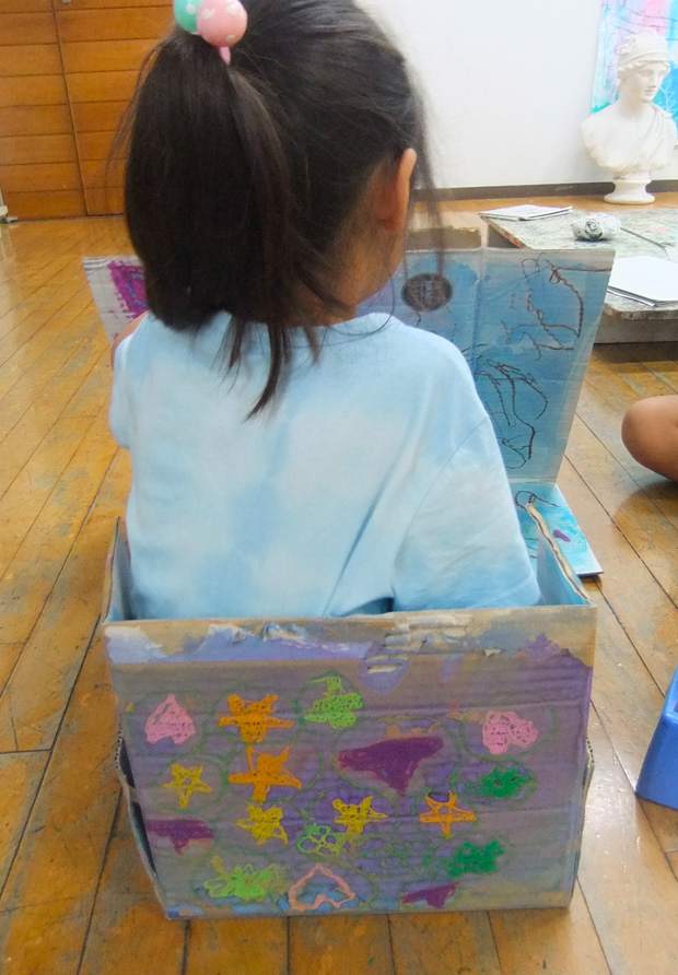 立方体の段ボール箱を平面に開き、絵を描き、元の形とは異なる立体を再構成していきます。