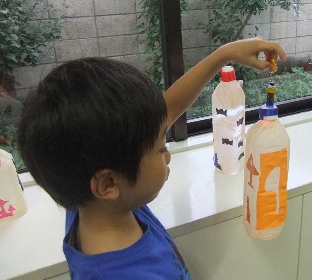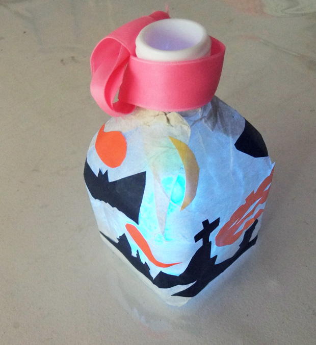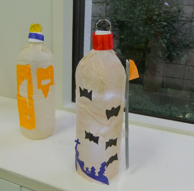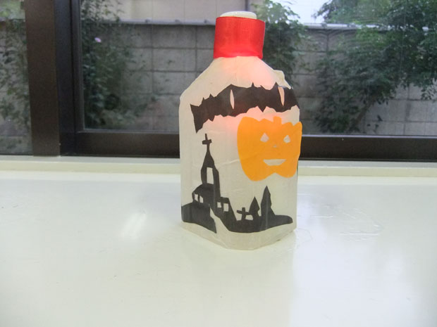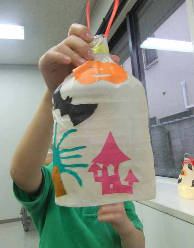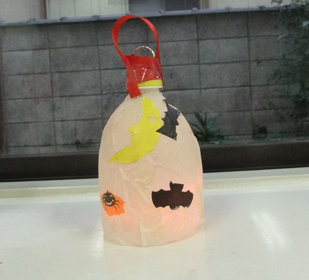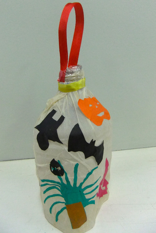 10月工作の様子(美術から子育てを学ぶ会) 投稿日時: 2013/11/14 投稿者: Tomoko Maezawa 10月のテーマは 『ハロウィン飾り〜デコパージュでランタンを作ろう〜』です。 10月は、子どもが大好きなイベント ハロウィンの季節です。 ハロウィンランタンを身近な素材から作りました。 どこのご家庭でもあるペットボトルと紙ナフキンが素材のベースです。 今回の技法はデコパージュです。 完成です! 悪魔の持ち物「斧」を付けました。(手前) かぼちゃのお化けと斧です。(奥) 和風ハロウィン。 おばけと言えば「柳」です! 中のライトの色を2色にしました。 持ち歩けます。