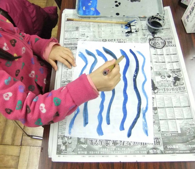 墨と水彩絵具を用いて、描いていきます。