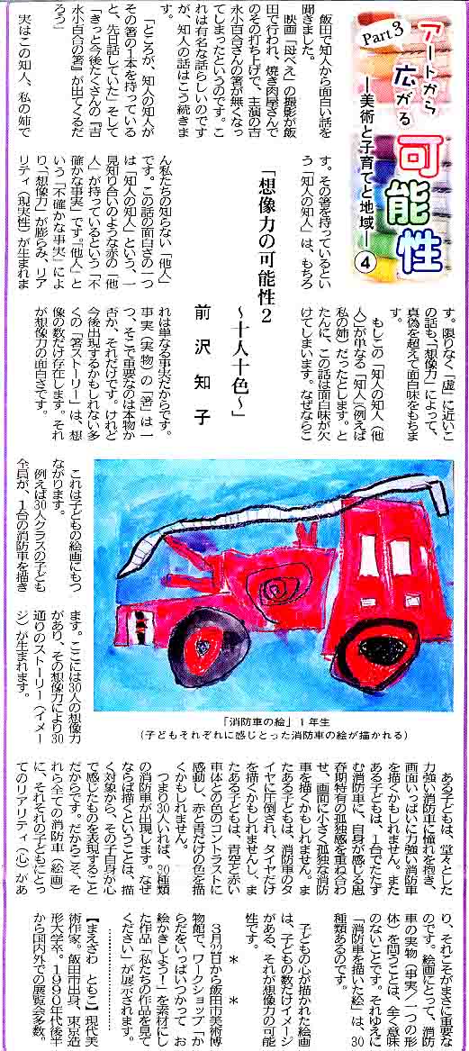 アートから広がる可能性Part3 投稿日時: 2013/02/17 投稿者: Tomoko Maezawa 連続コラム『アートから広がる可能性〜美術と子育てと地域〜』 Part3-4『想像力の可能性〜十人十色〜』 南信州新聞に掲載中 (現在Part7、全36回まで執筆)