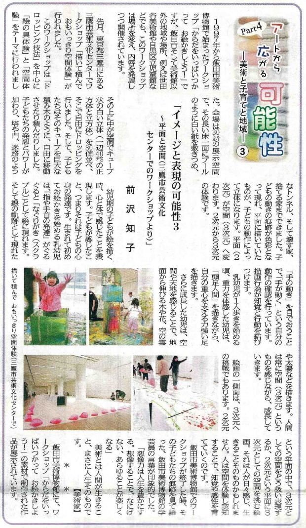 アートから広がる可能性Part4 投稿日時: 2013/02/18 投稿者: Tomoko Maezawa 連続コラム『アートから広がる可能性〜美術と子育てと地域〜』 Part4-3『イメージと表現の可能性3〜平面と空間(三鷹市芸術文化センターでのワークショップより)〜』 南信州新聞に掲載中 (現在Part7、全36回まで執筆)