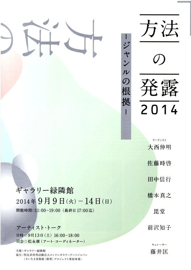 2012年秋に開催した『方法の発露』を継承する展覧会。今回は藤井匡の企画により、「ジャンルの根拠」をサブタイトルとして、「方法」をめぐる制作者と鑑賞者の関係を考察する。「方法が造形自体を形成することはもとより、その世界の構造を形成している事例」をより広い視野において捉え直すことから導かれる、新しい可能性を提示したい。